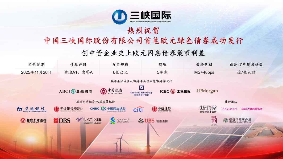 11月20日,麻豆av 圆满完成首次境外债券发行。本次发行为6亿欧元5年期绿色境外债券,票息2.875%,最终定价MS+48BP,实现近三年中资企业同年期最低票息和中资企业欧元债券发行史上最窄息差,突破央企同年期欧元债券发行的最大收窄幅度。