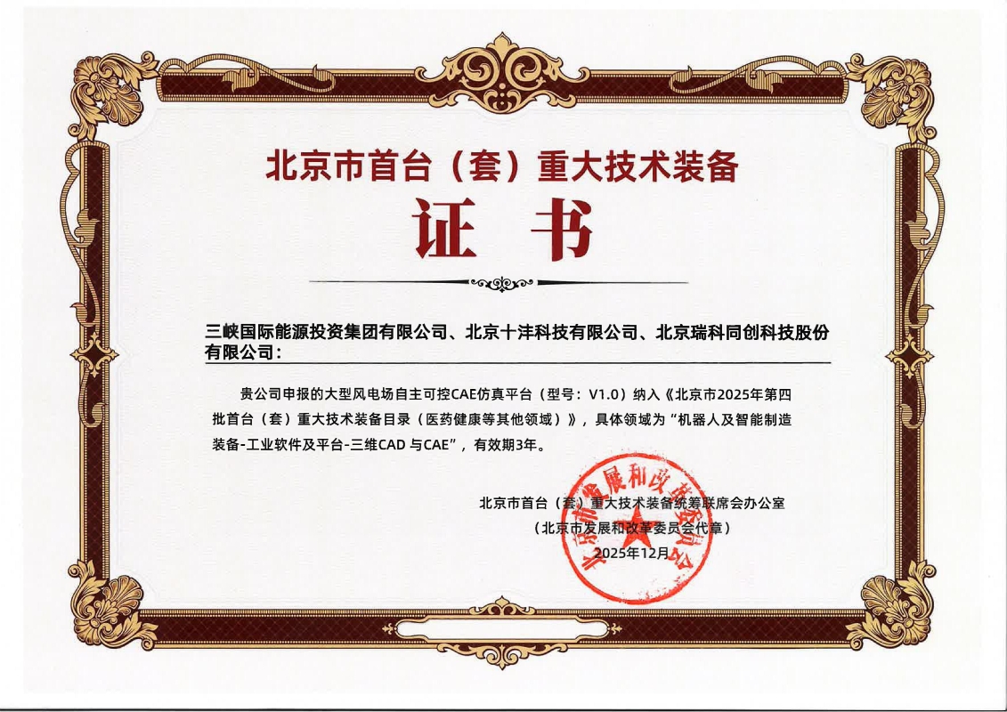 此次获批的北京市首台(套)重大技术装备由公司创新业务发展与研究中心负责牵头研发,参加单位包括北京十沣科技有限公司和北京瑞科同创科技股份有限公司。该平台已应用在三峡亚非公司约旦沙巴克风电场,为海外新能源项目提供高精度仿真与评估能力,是我国风电领域自主研发与装备国际化应用的重要实践。