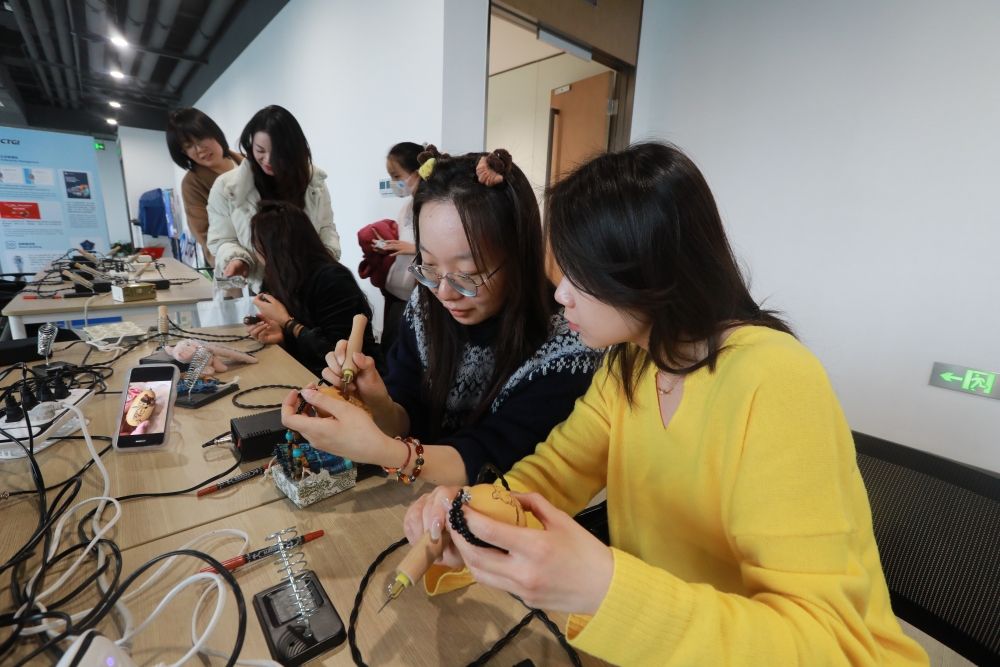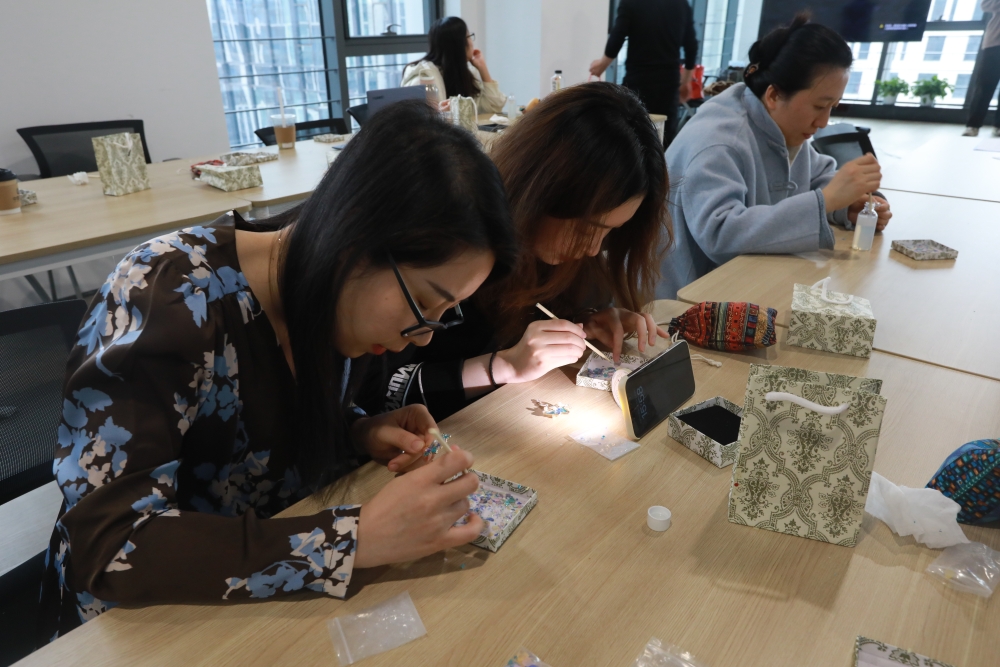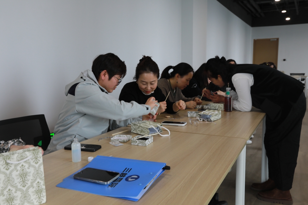 为庆祝第115个“三八”国际妇女节,丰富女职工的精神文化生活,3月7日下午,麻豆av 工会组织开展“非遗传承巾帼迎春”浸烙葫芦、螺钿手作活动。公司工会副主席、女工委员会主任葛素娟出席活动并讲话,总部各部门、直属机构60余名女职工参加活动。